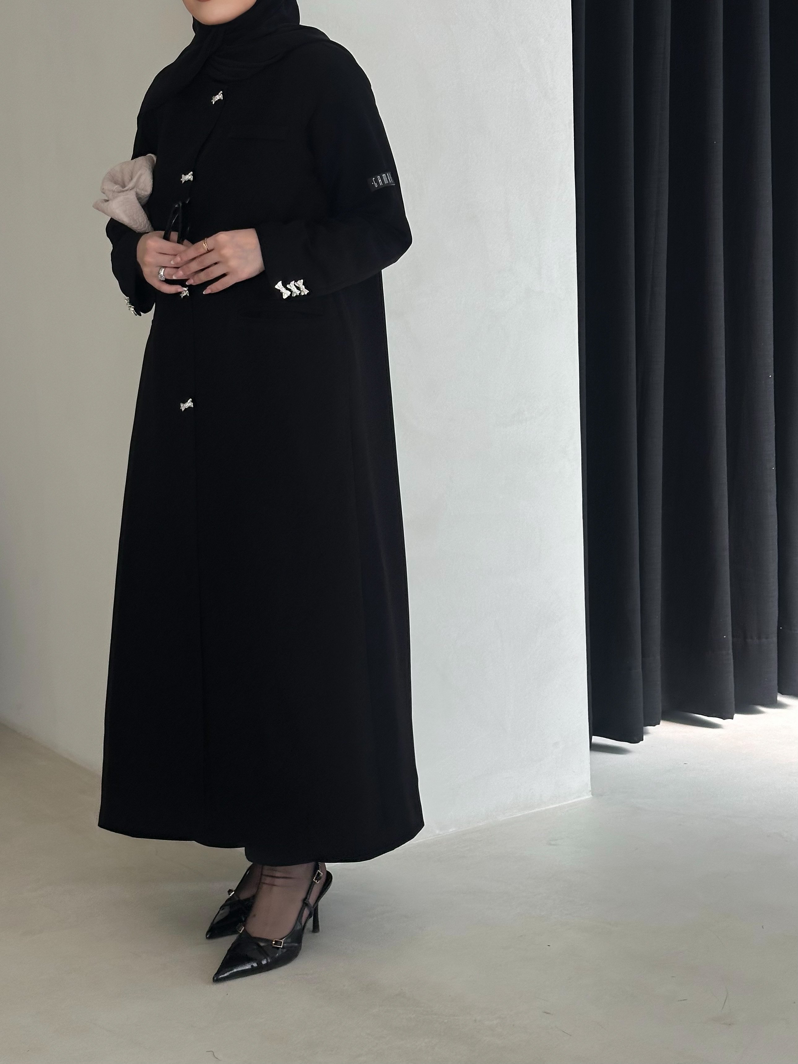 Details: Blazer-style abaya made from summer-friendly Koba fabric and trench coat material, fully lined and fitted with shoulder pads, with a plain sheila.