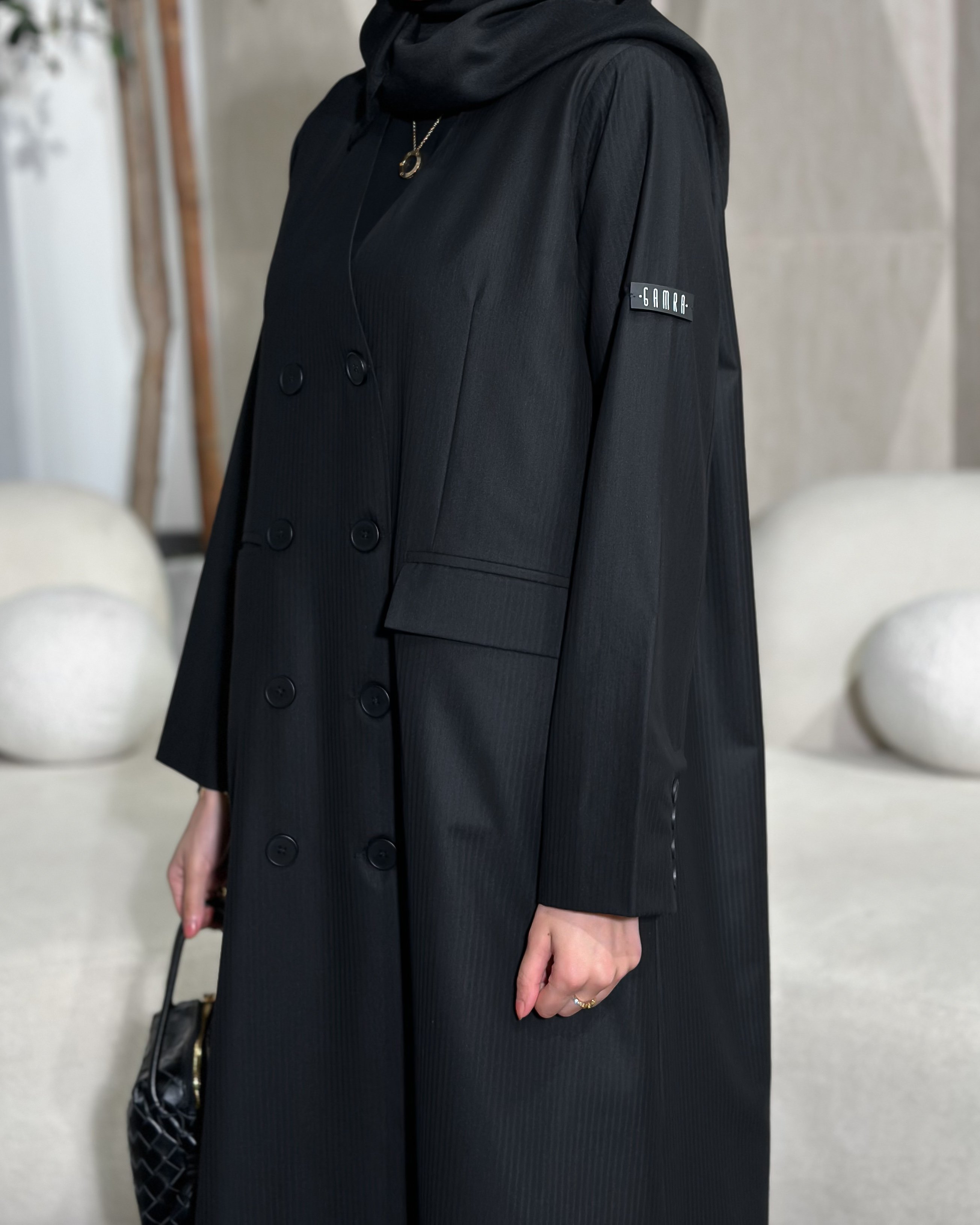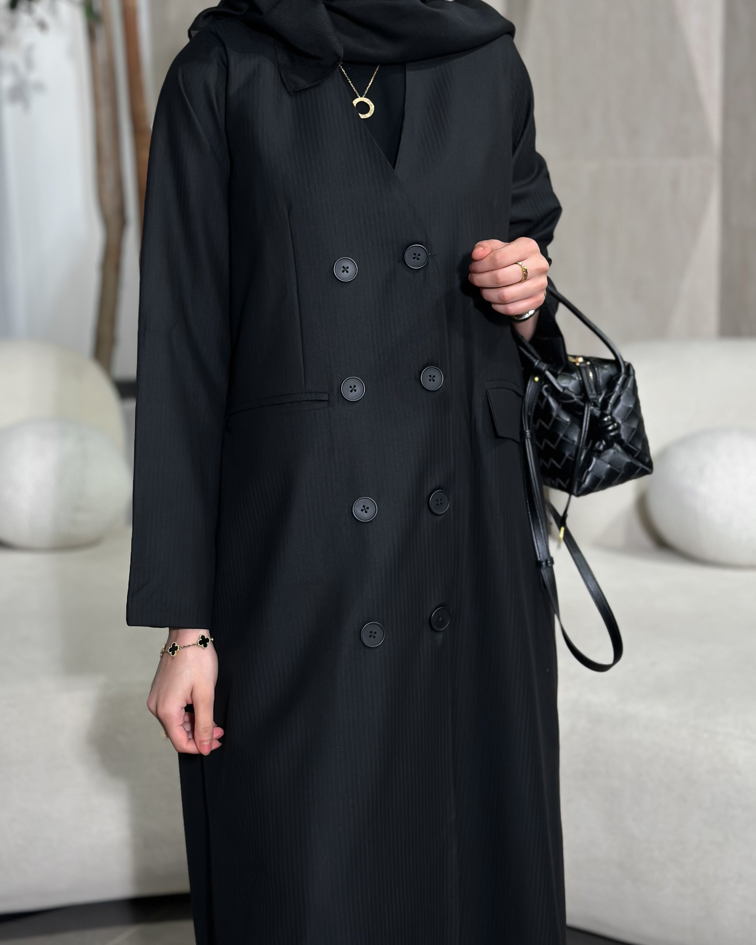 Details: Blazer-style abaya made from summer-friendly cashmere fabric, fully lined and fitted with shoulder pads, with a plain sheila. Care instructions: Please handle the abaya with care when washing. We recommend dry cleaning at specialized laundries.