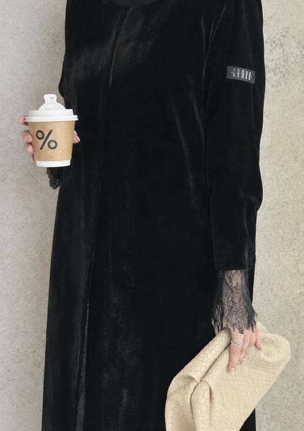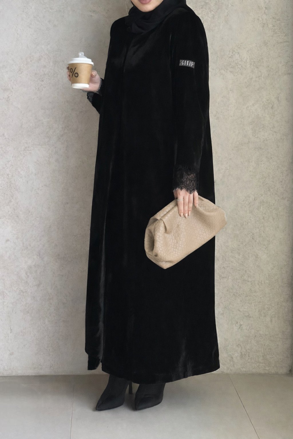 عبايه مخمل بقصة كتف و مزوده بدانتيل فرنسي مبطنه مزوده بكتافيات