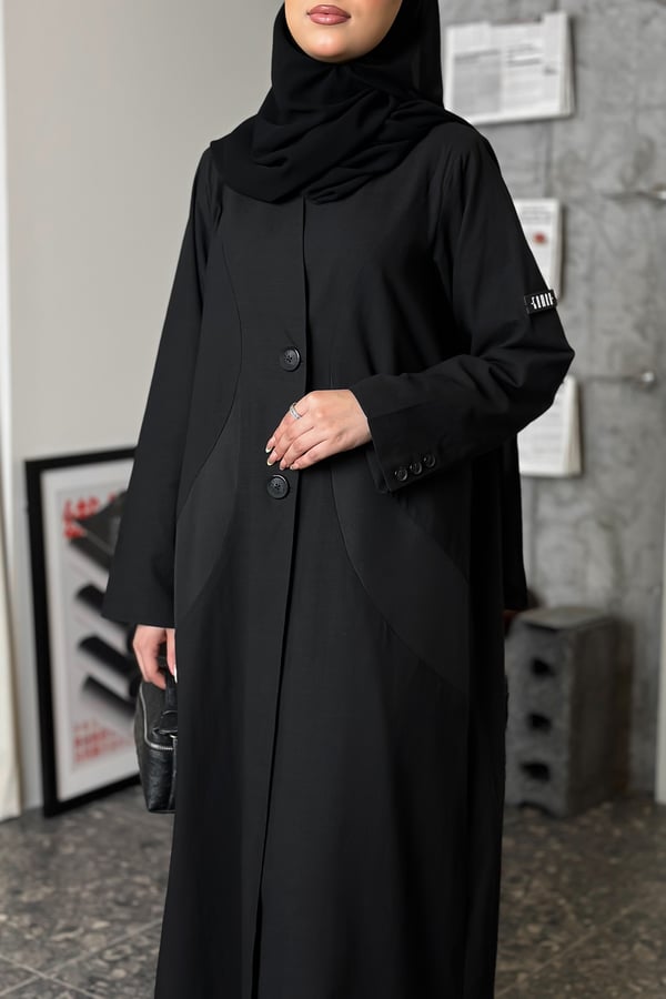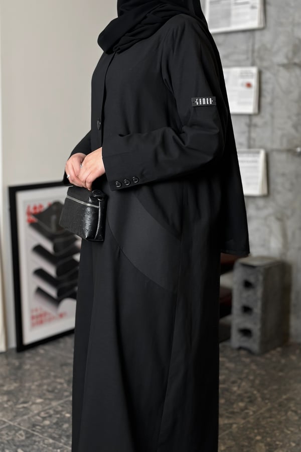 عباية بليزر مبطنة مع كتافيات، مكس من لنن وقطن أسود. متوفرة بخامتين: لنن وكوبا. الخامة المعروضة: لنن