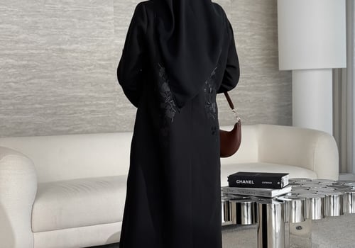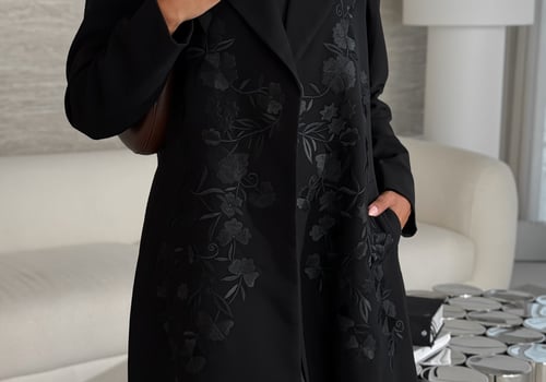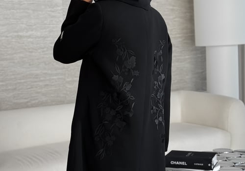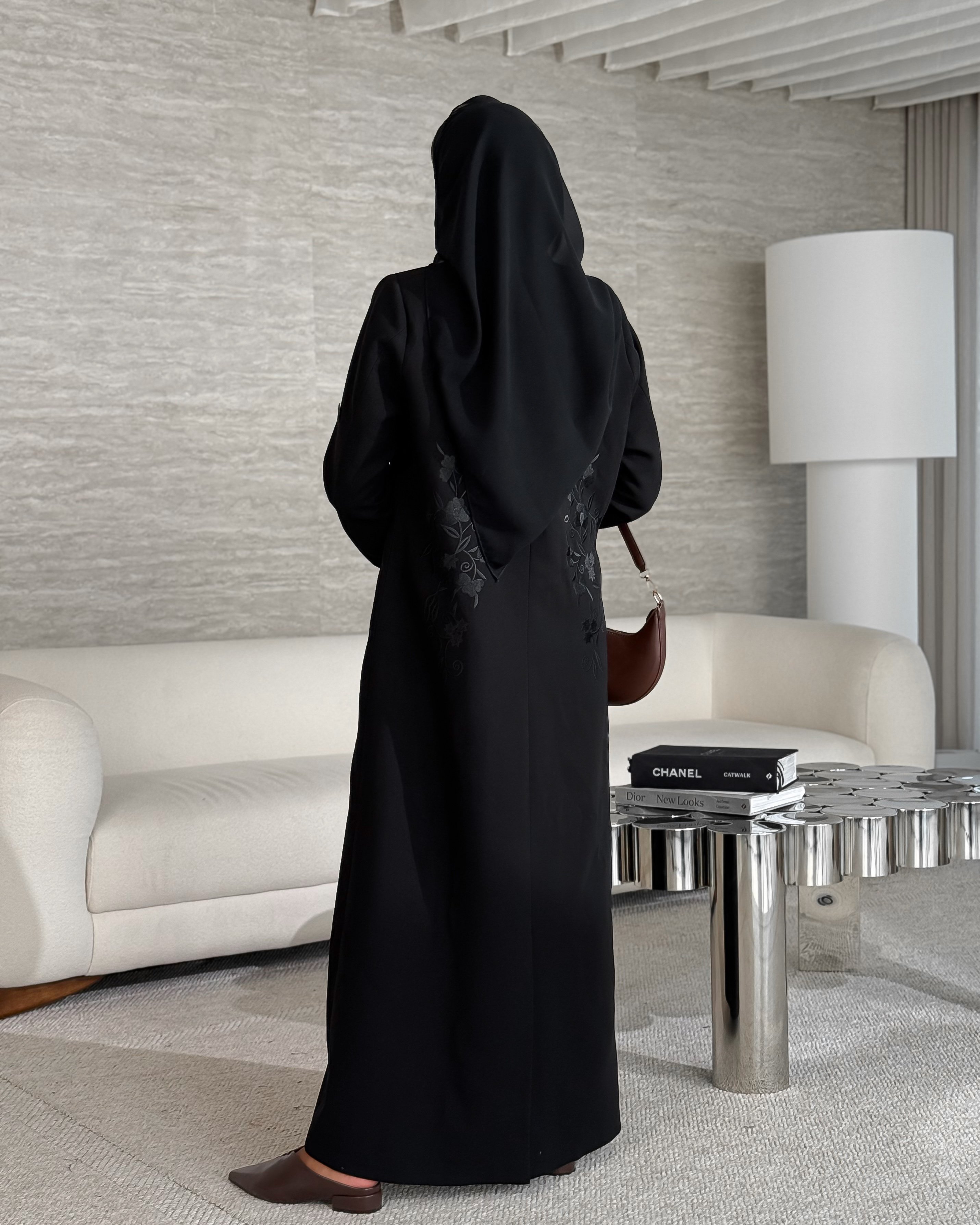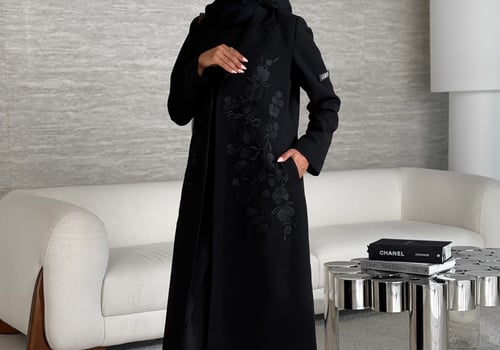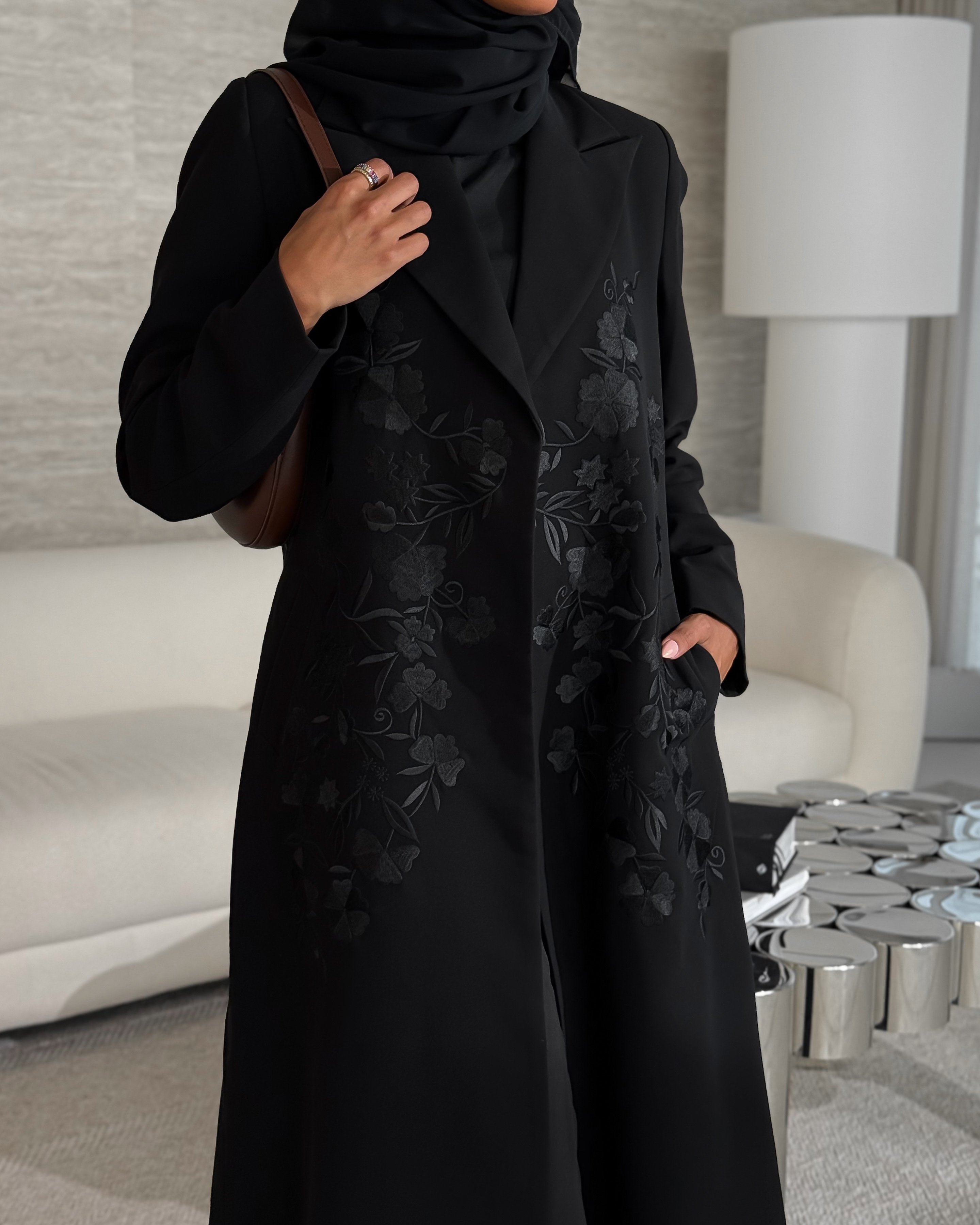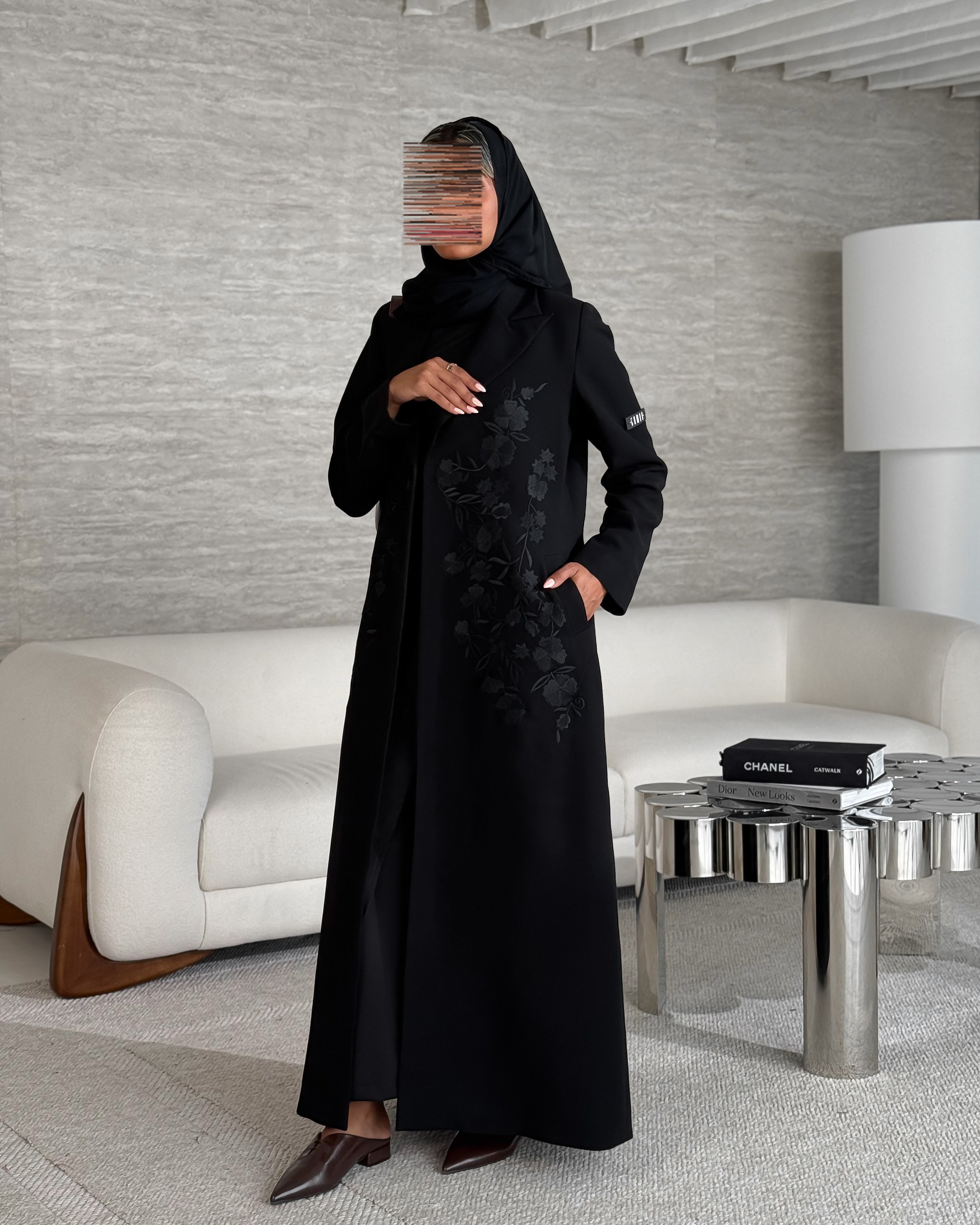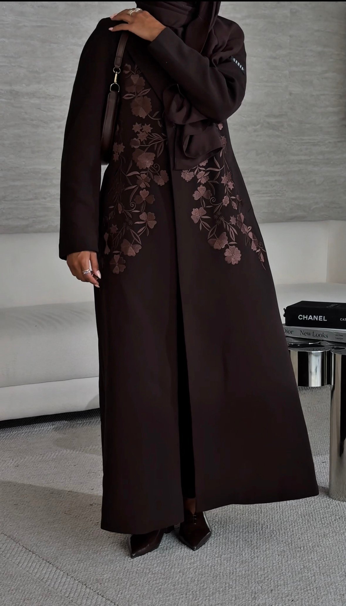Blazer-style abaya with elegant embroidery, crafted from luxurious Koba fabric, fully lined, and features structured shoulders and a plain sheila. ? Available in two colors: Black and Brown.