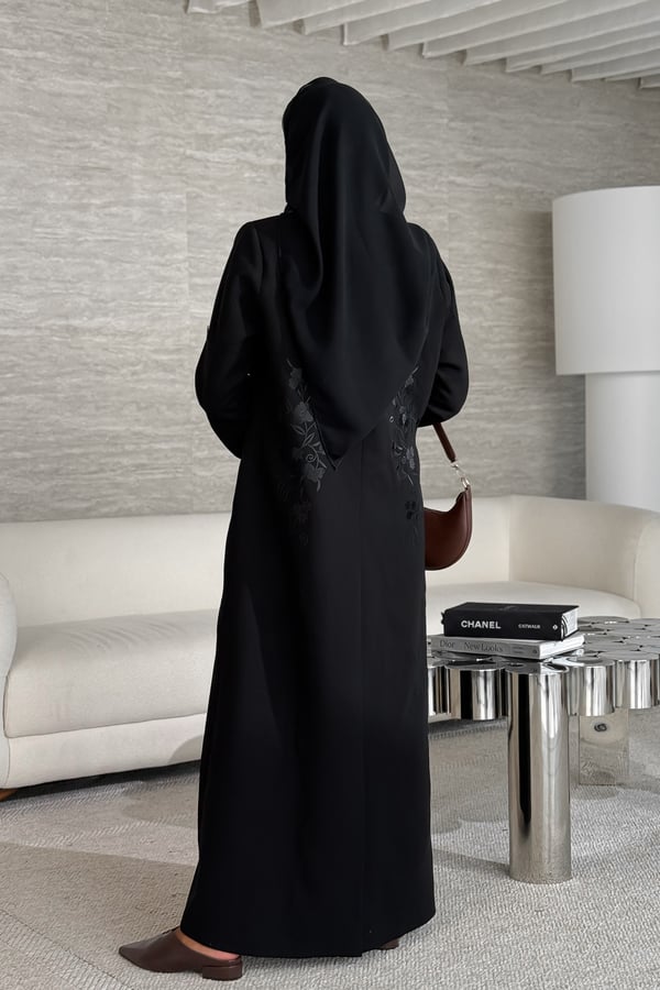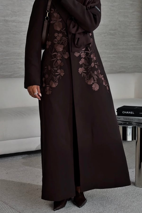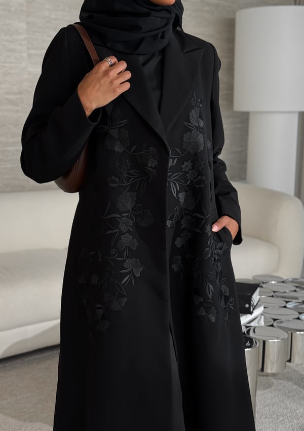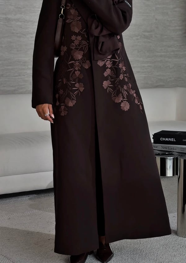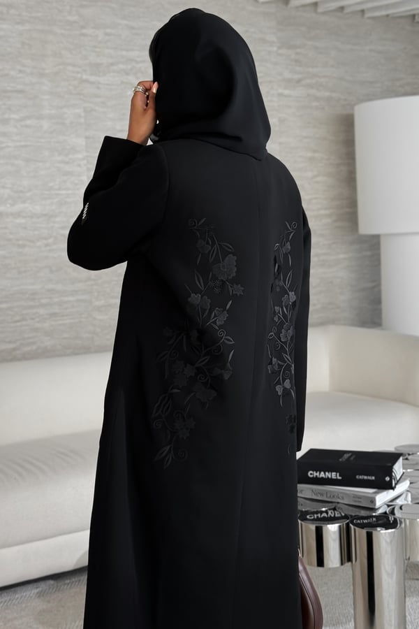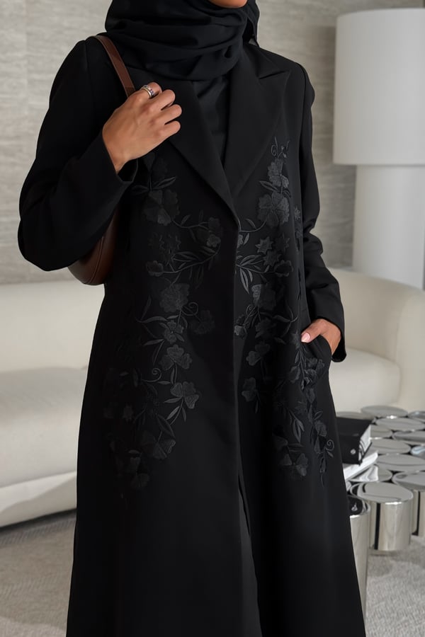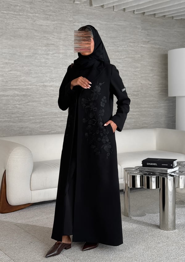 عباية بليزر مطرزة، مصنوعة من خامة كوبا الفاخرة، مبطنة بالكامل ومزودة بكتافيات وملفع سادة. ✨ متوفرة بلونين: الأسود والبني
