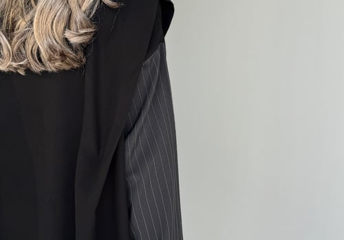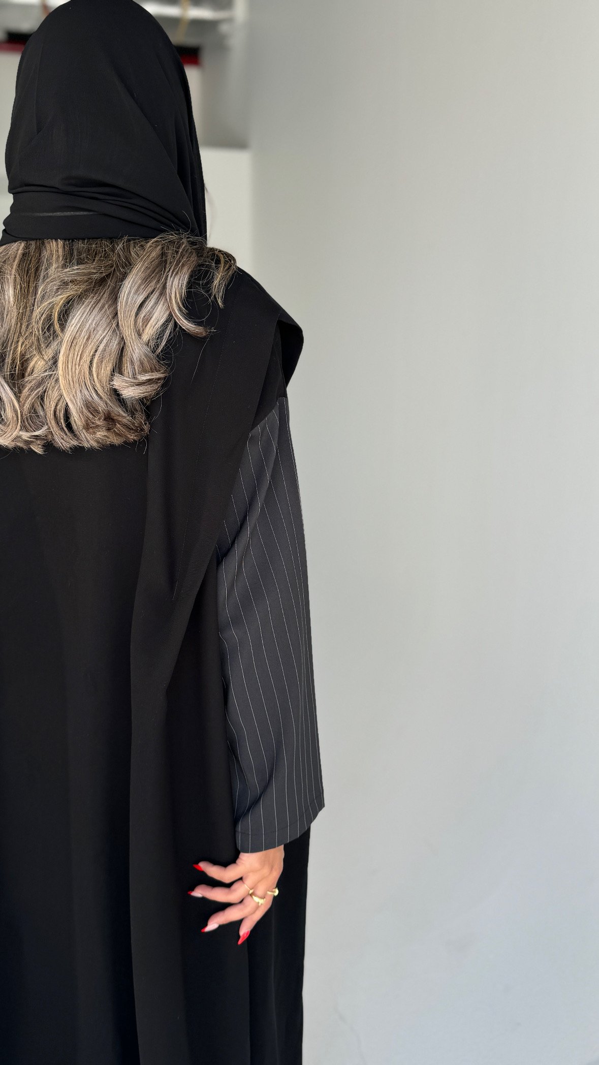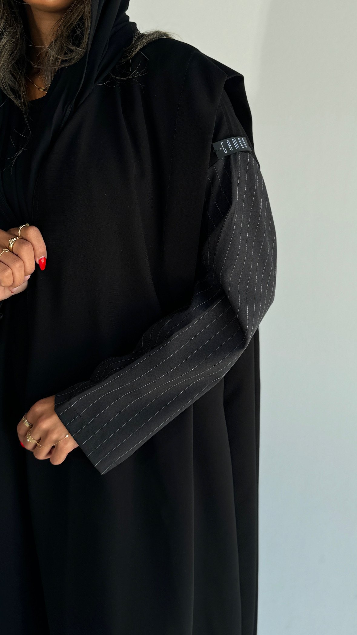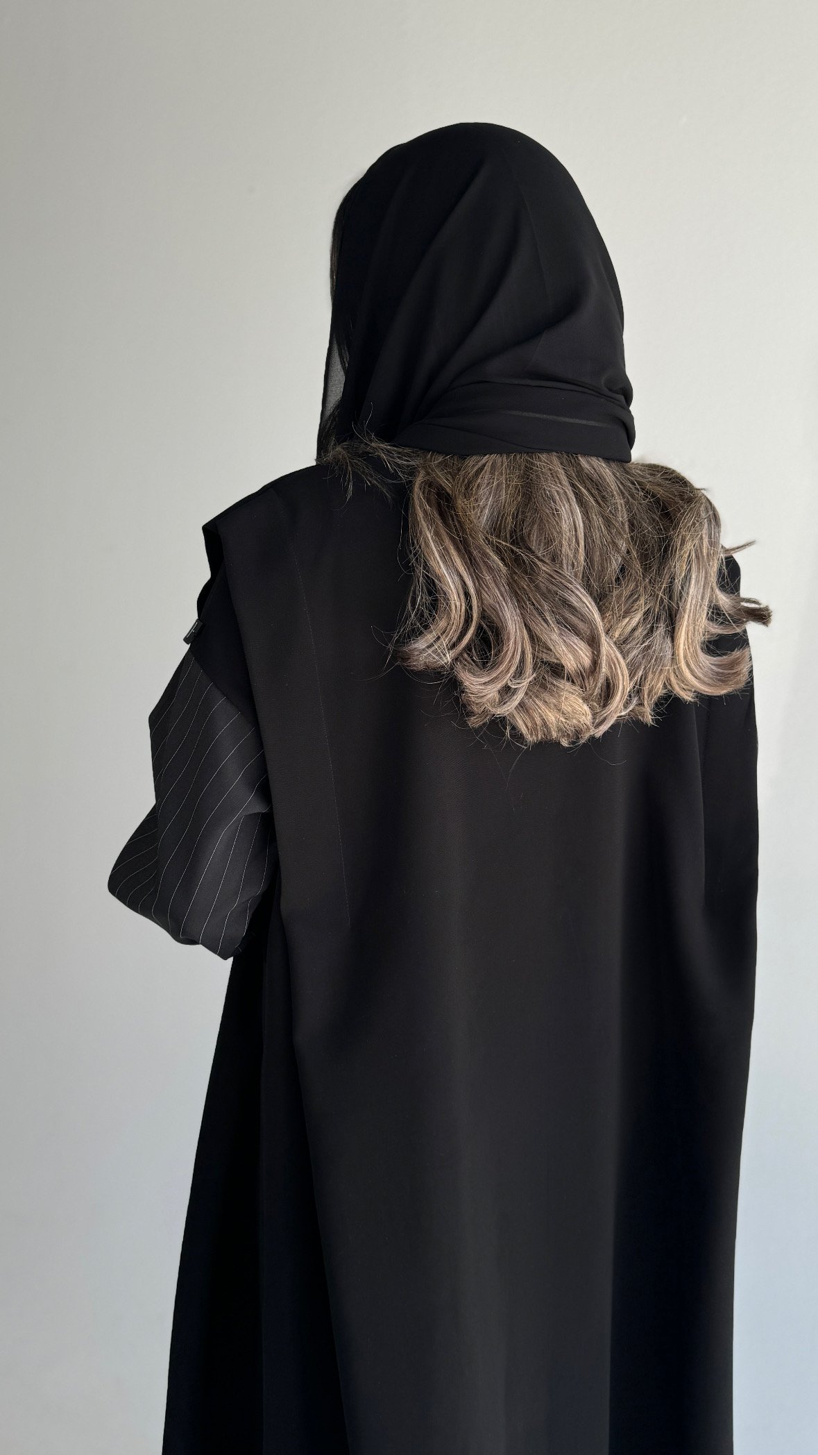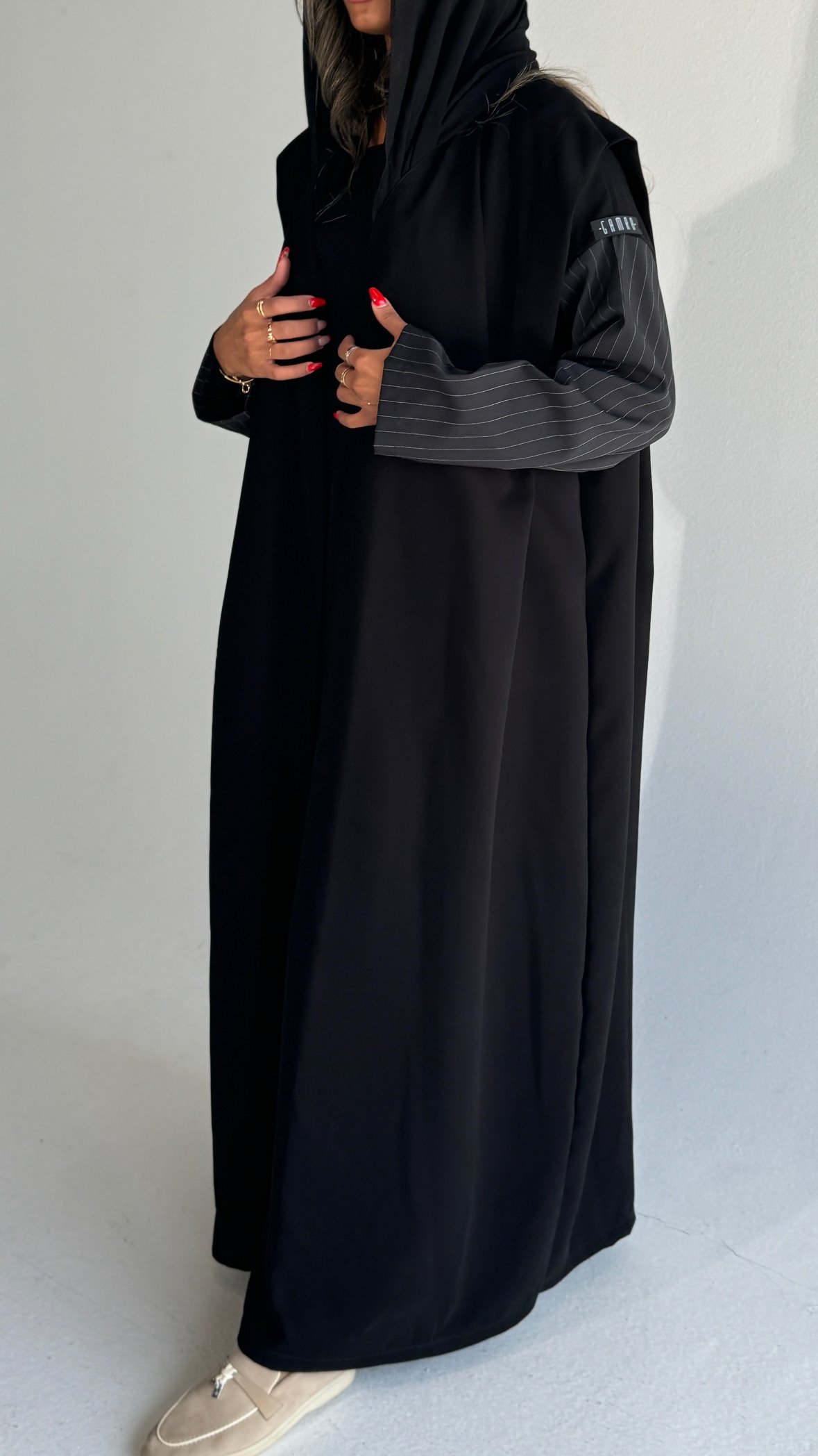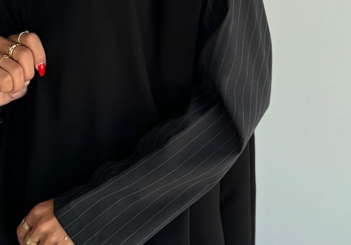Details: Soft crepe abaya with stripped fabric on the sleeves, half-length open-front design, black shawl.