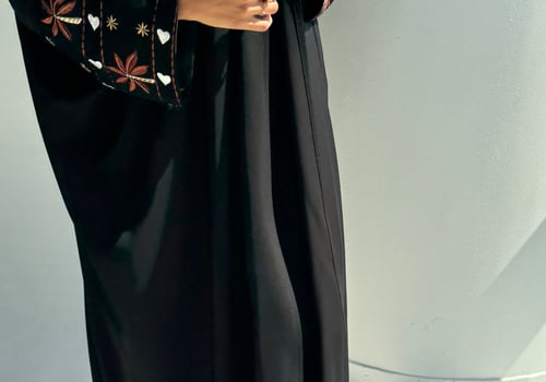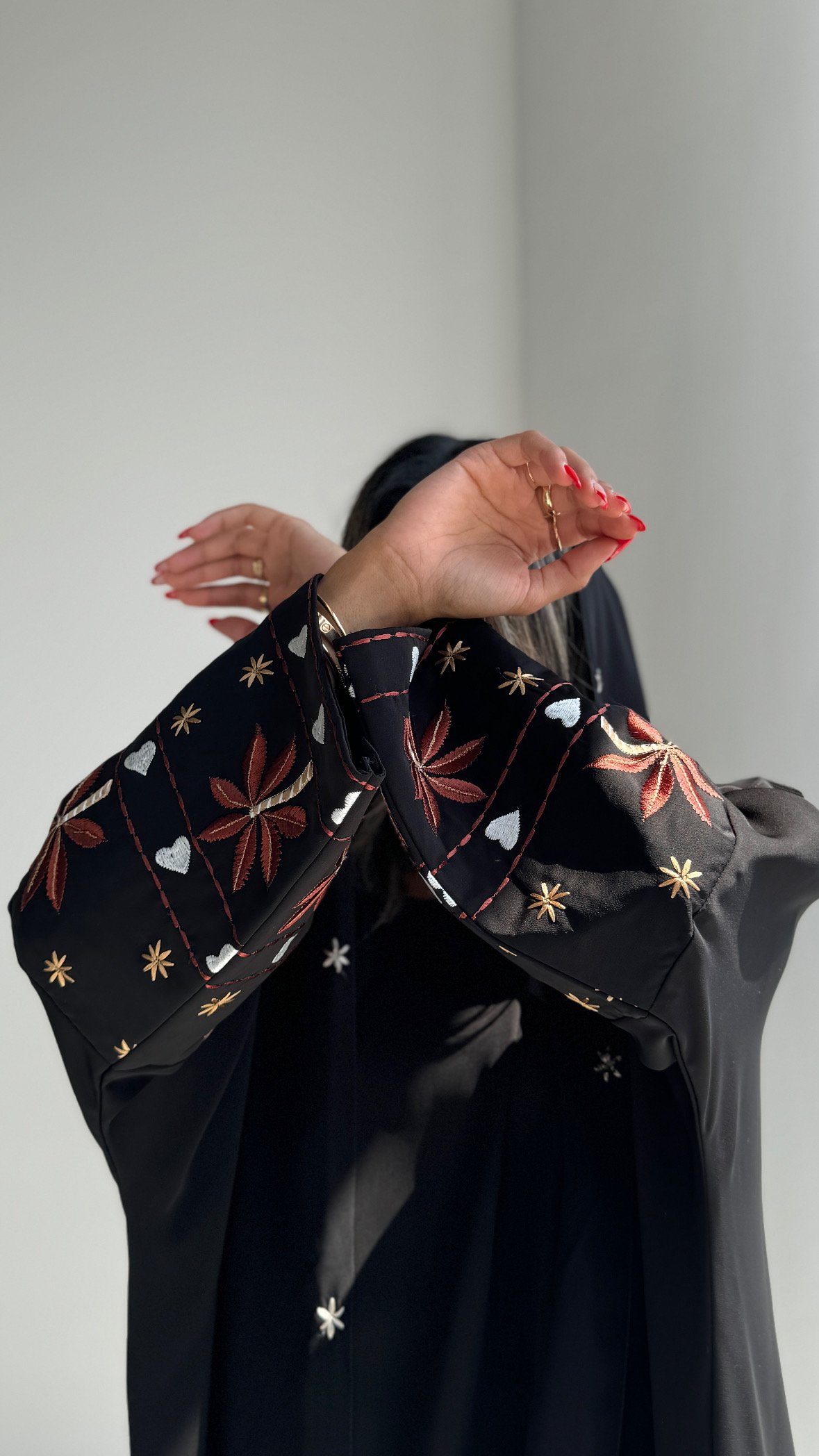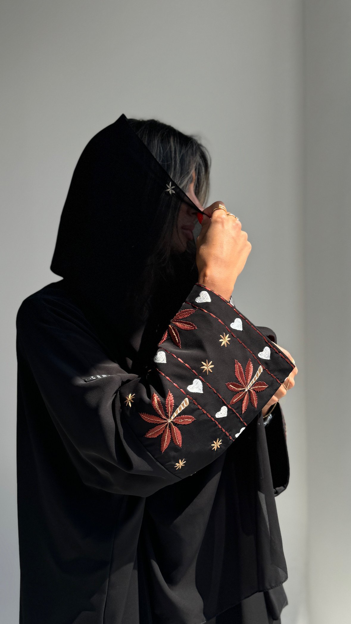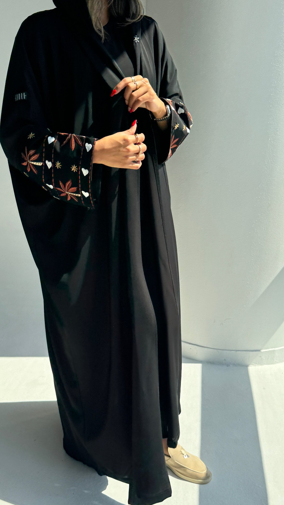 Details: Soft crepe abaya with embroidered sleeves, half-length open-front design, black shawl with embroidered edges.