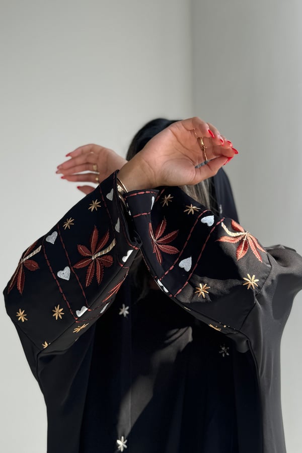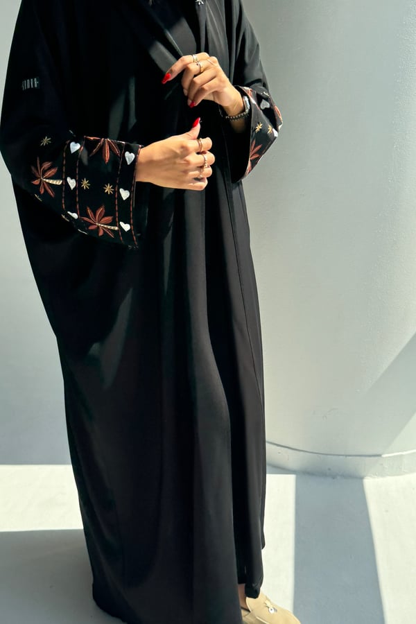 التفاصيـل : عباية كريب ناعم تطريز كم ، قصة نص بشت ،ملفع اسود طرف تطريز