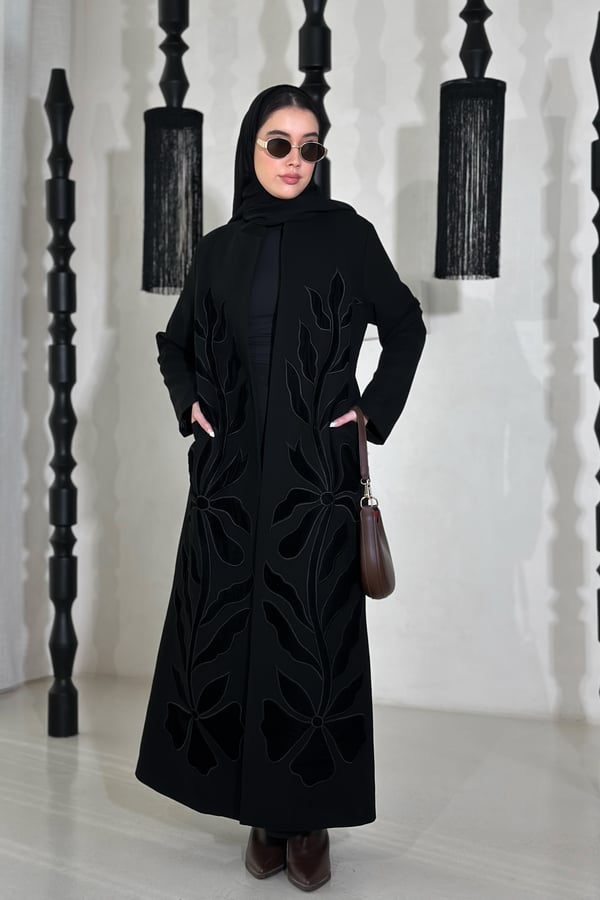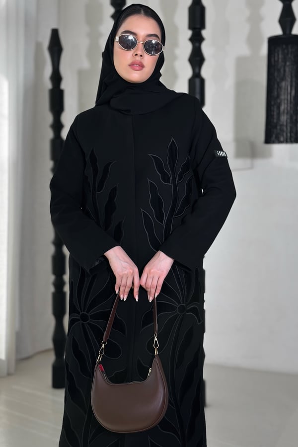 عباية بليزر مميزة بتطريز مخمل بتقنية الـ Appliqué Embroidery، مصنوعة من خامة كوبا ، مبطنة بالكامل ومزودة بكتافيات وملفع سادة.