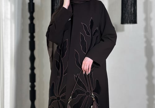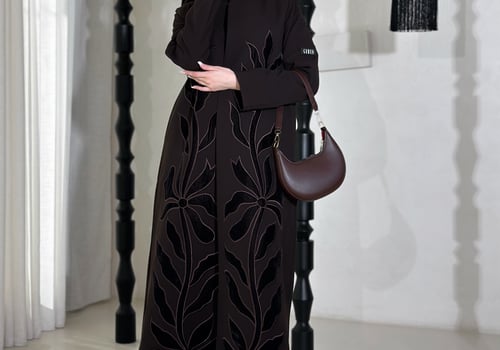 عباية بليزر مميزة بتطريز مخمل بتقنية الـ Appliqué Embroidery، مصنوعة من خامة كوبا ، مبطنة بالكامل ومزودة بكتافيات وملفع سادة.