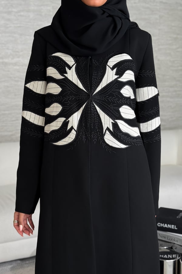 عباية بليزر مميزة بتطريز بتقنية الـ Appliqué Embroidery، مصنوعة من خامة كوبا الفاخرة، مبطنة بالكامل ومزودة بكتافيات وملفع سادة. ممكن تغير التطريز للاسود فقط