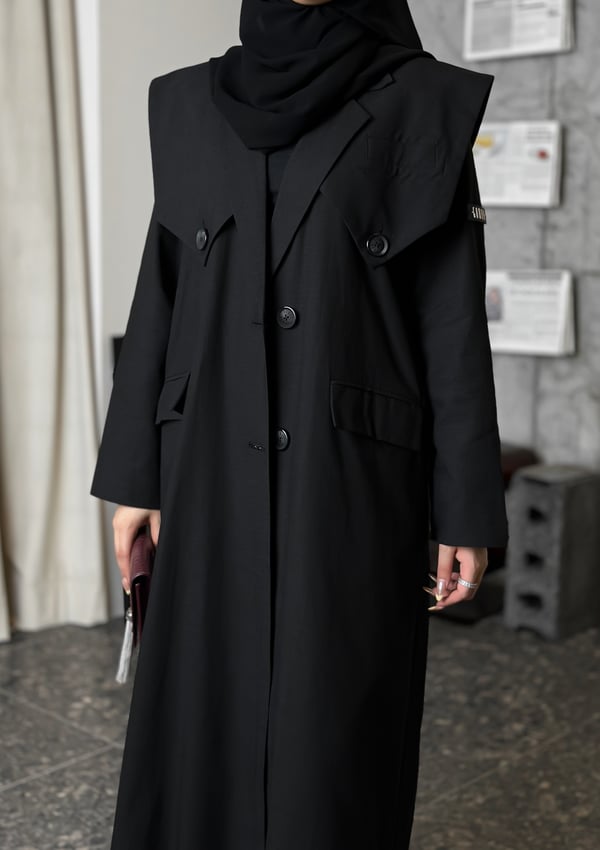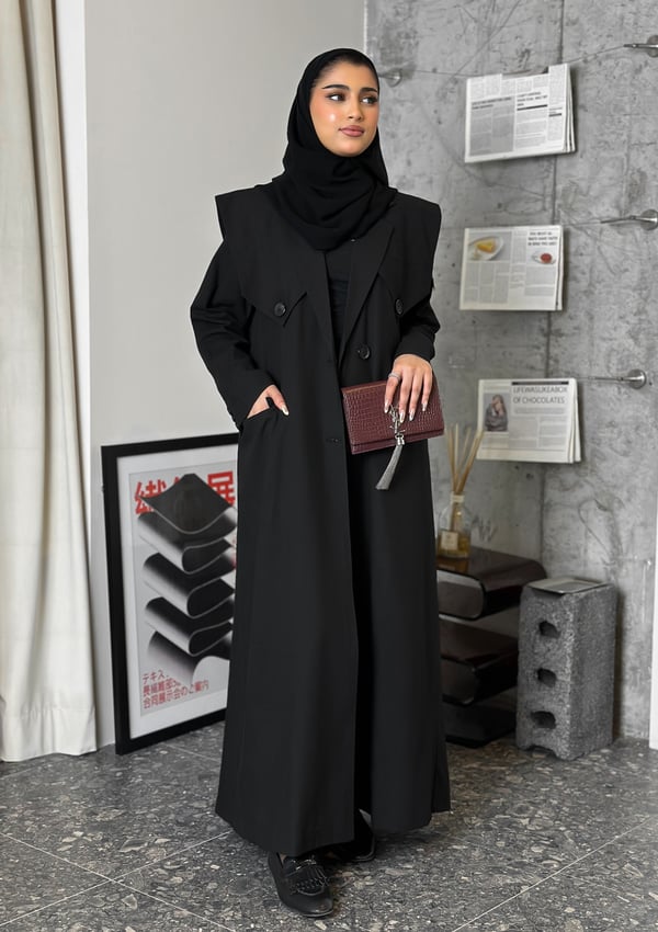 عباية بستايل بليزر مع قصّة تبرز الكتوف. متوفرة بخامتين: لنن وكوبا. الخامة المعروضة: لنن.