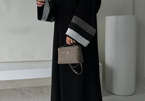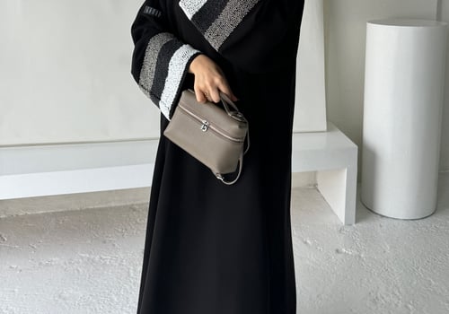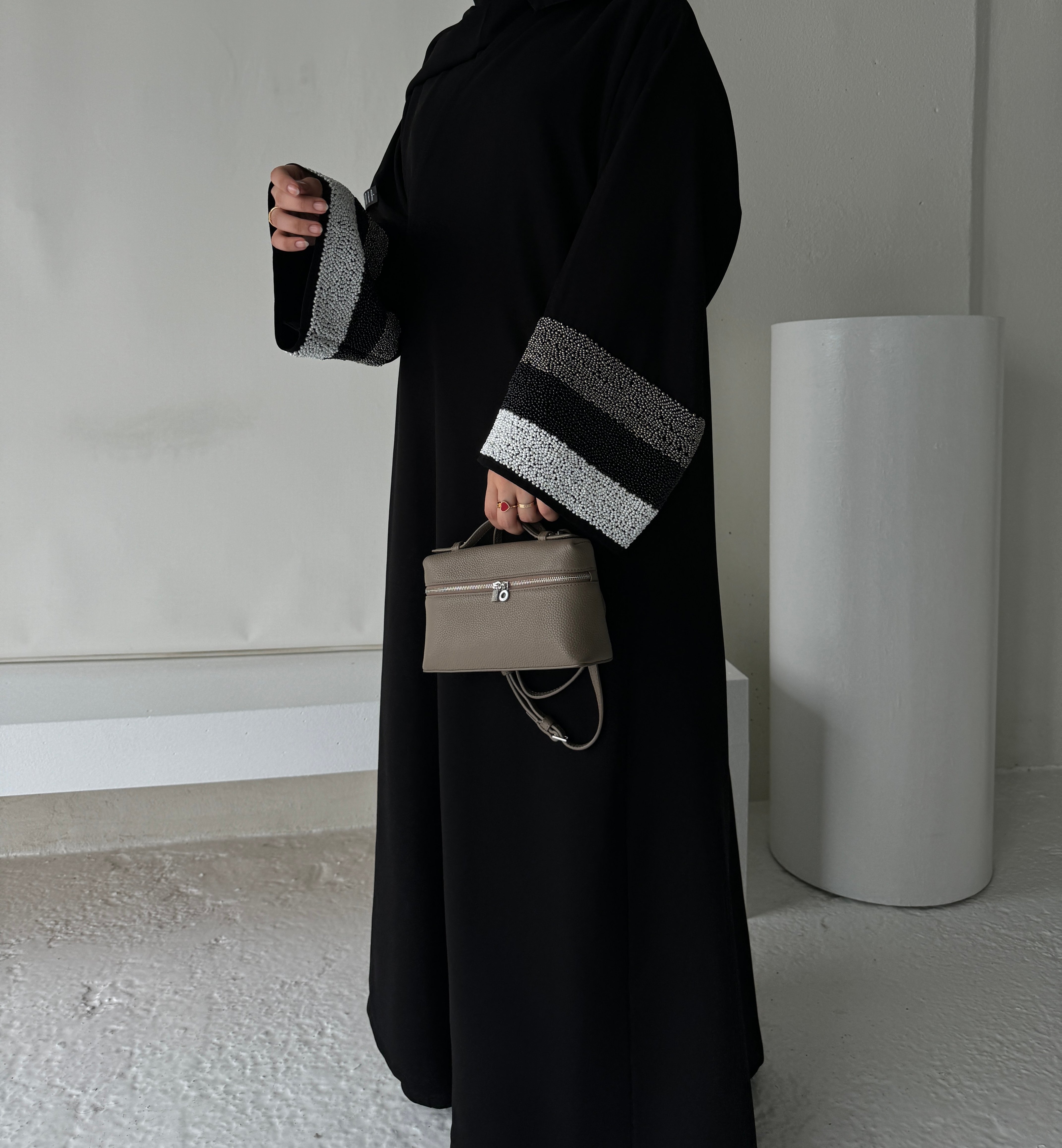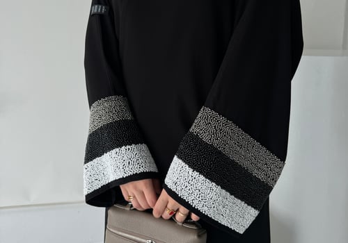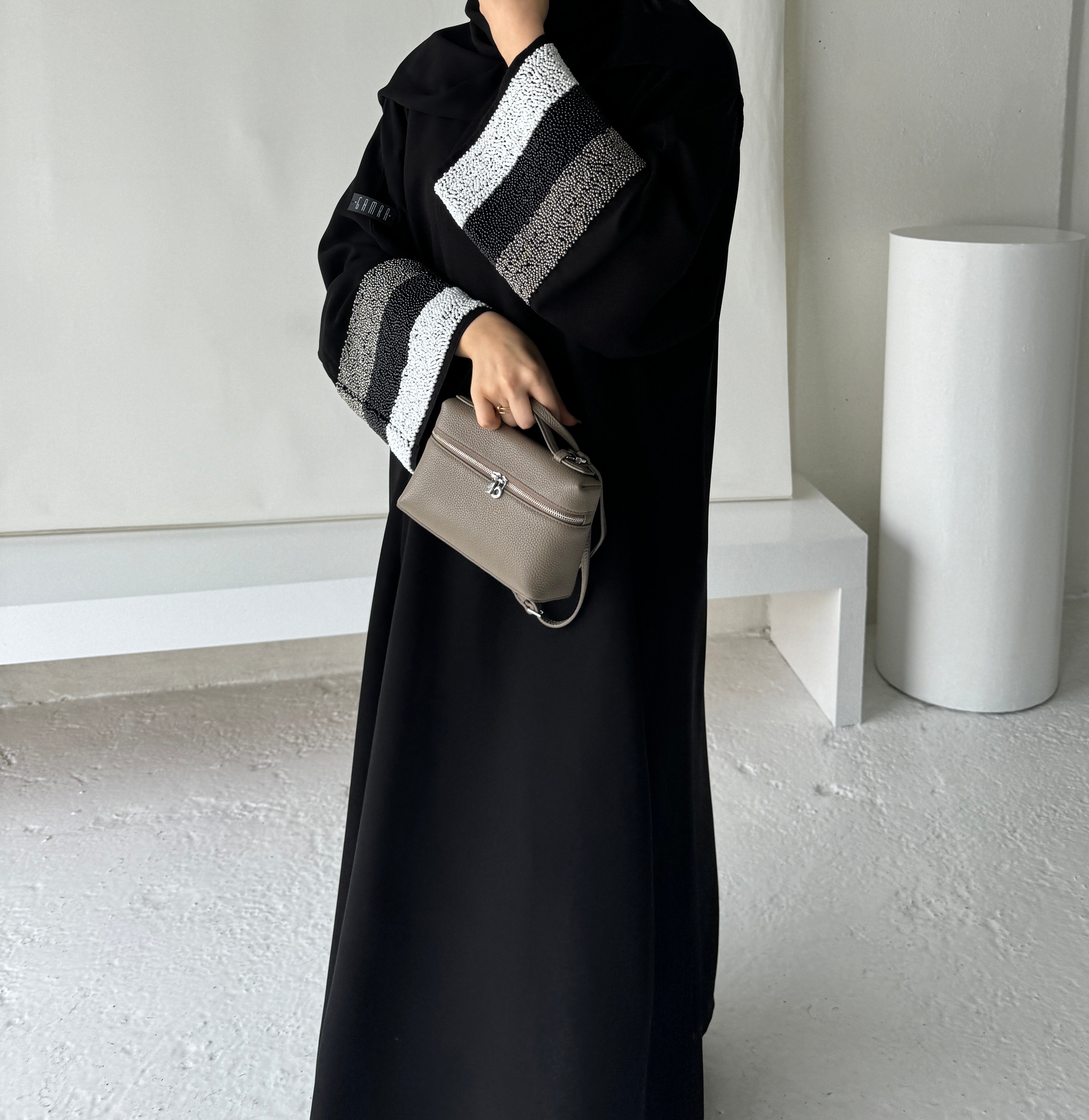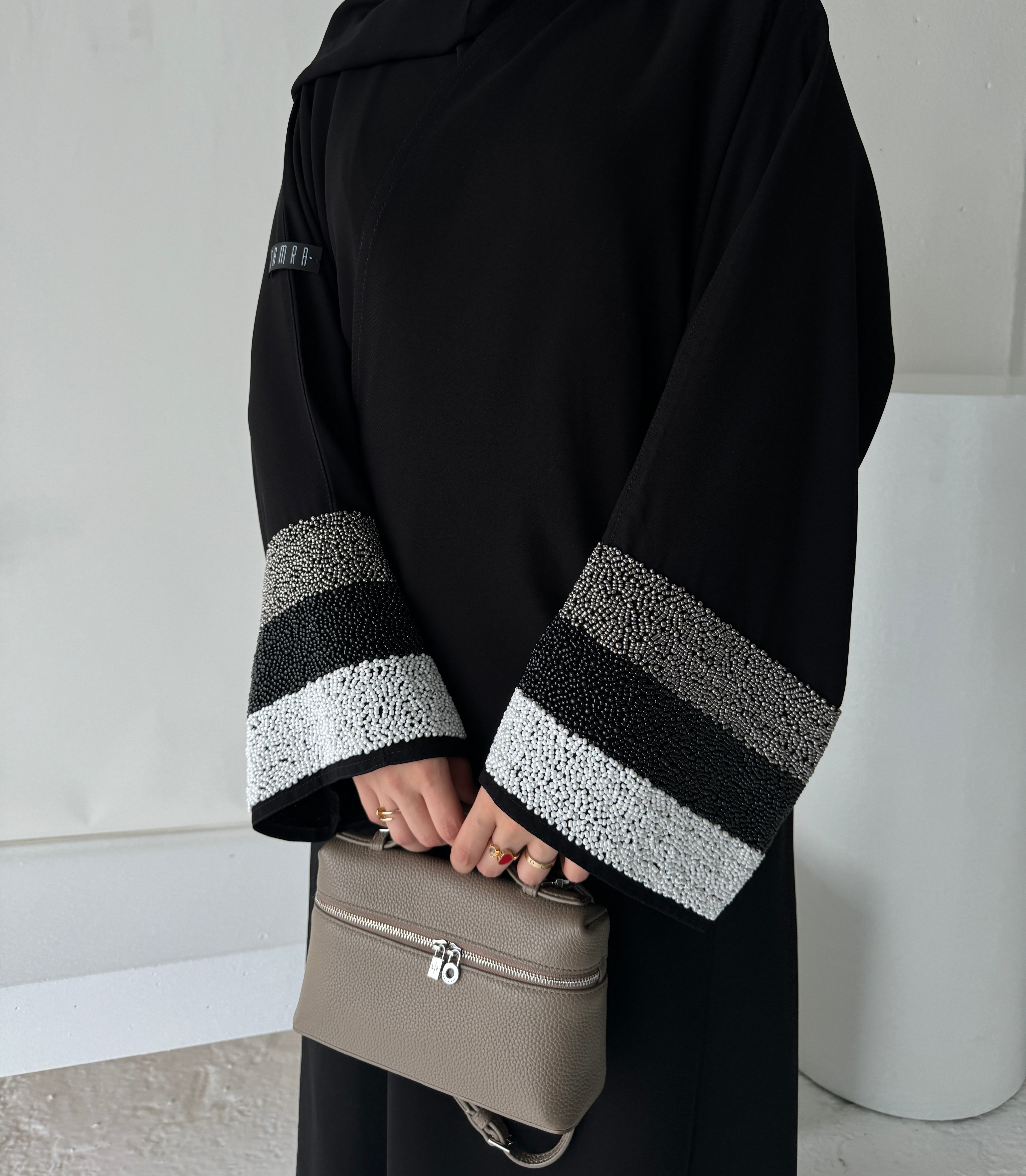 Bisht-style abaya with pearl embroidery, made from Koba fabric.
