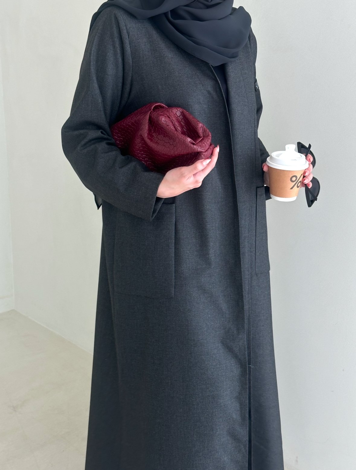 Details: Blazer-style abaya made from summer-friendly cashmere fabric, fully lined and fitted with shoulder pads, with a plain sheila.