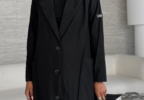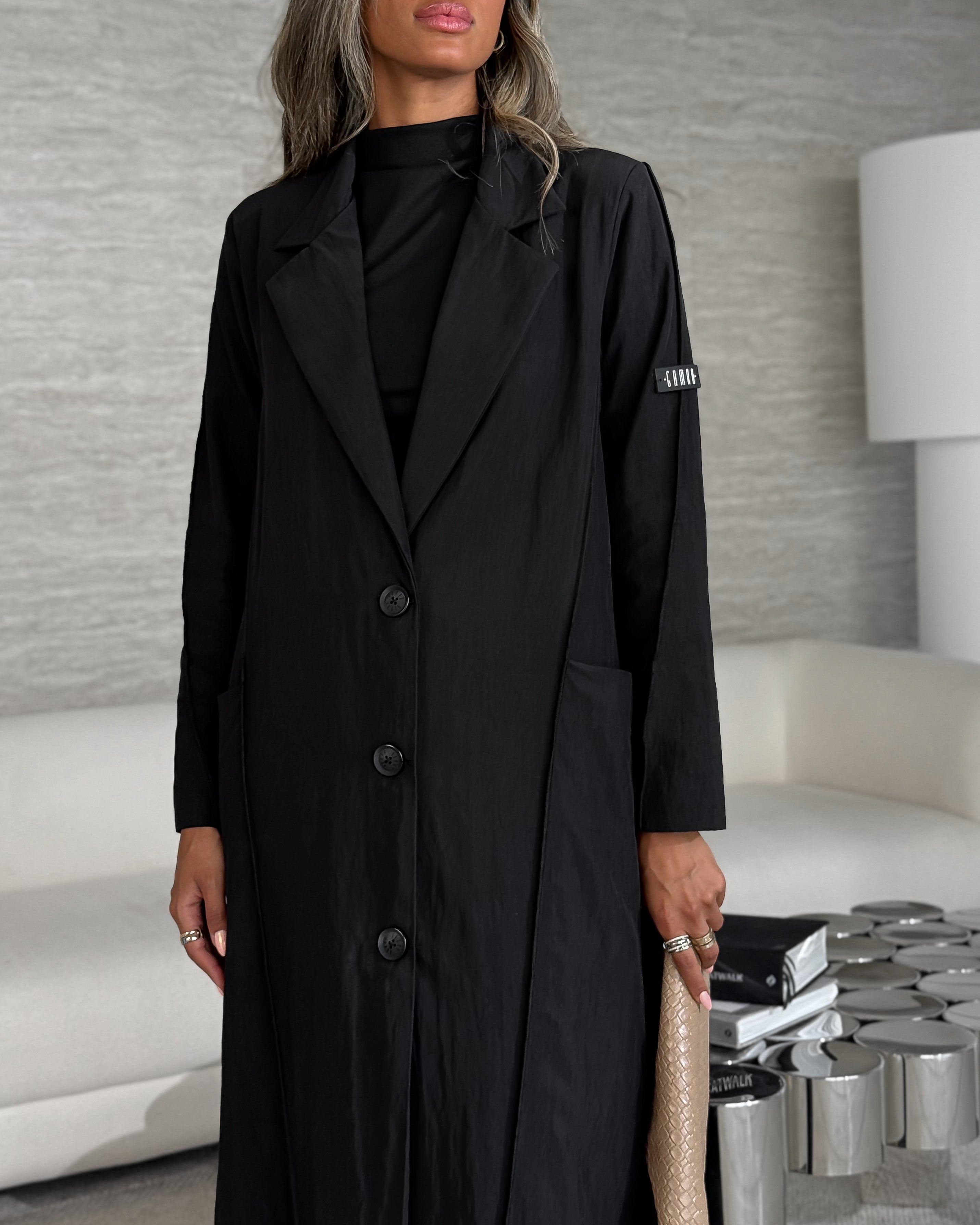 A practical blazer-style abaya made from trench coat fabric, designed with standout front and back cuts — perfect for those who love simple yet chic looks ??.