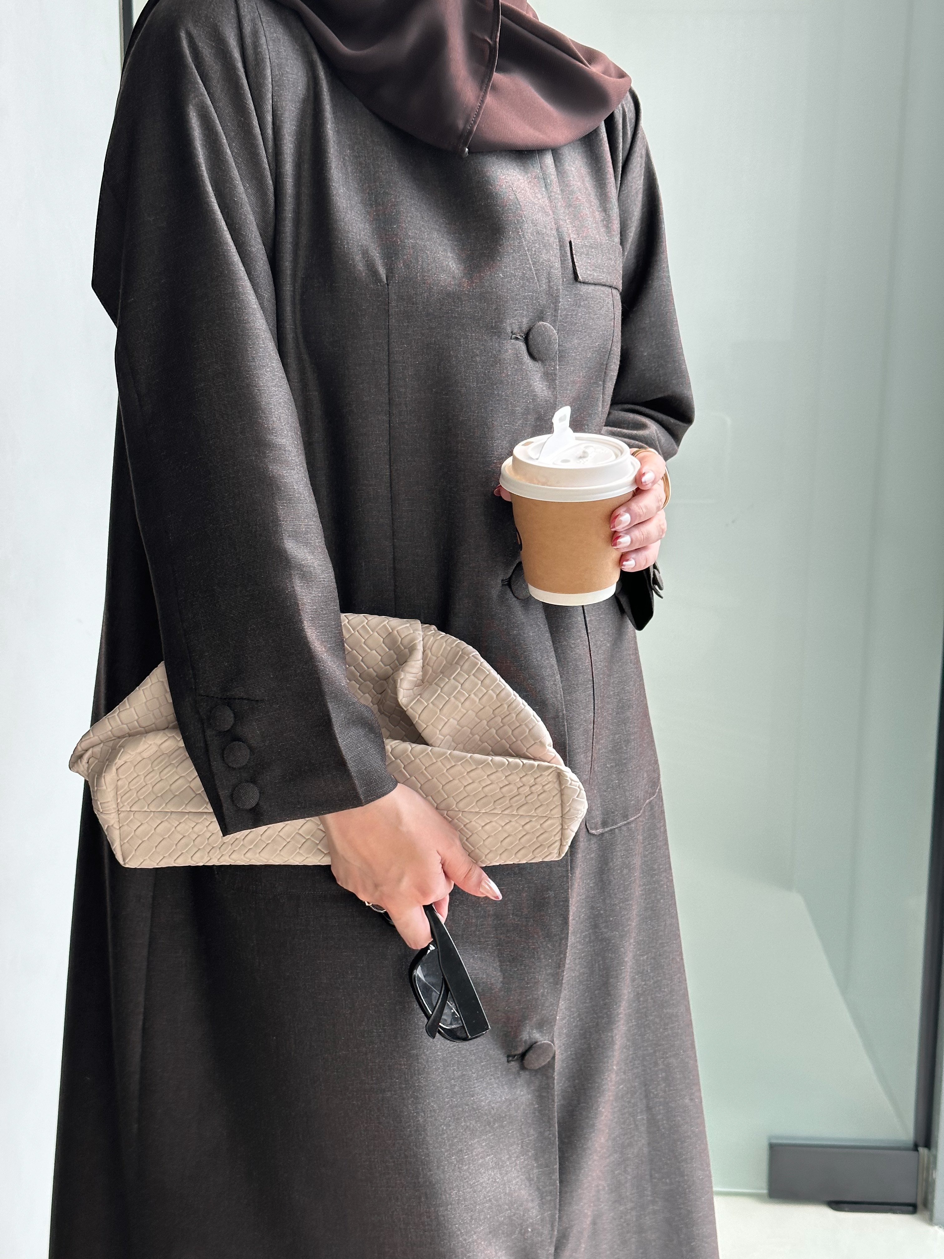 Details: Blazer-style abaya made from summer-friendly cashmere fabric, fully lined and fitted with shoulder pads, with a plain sheila.