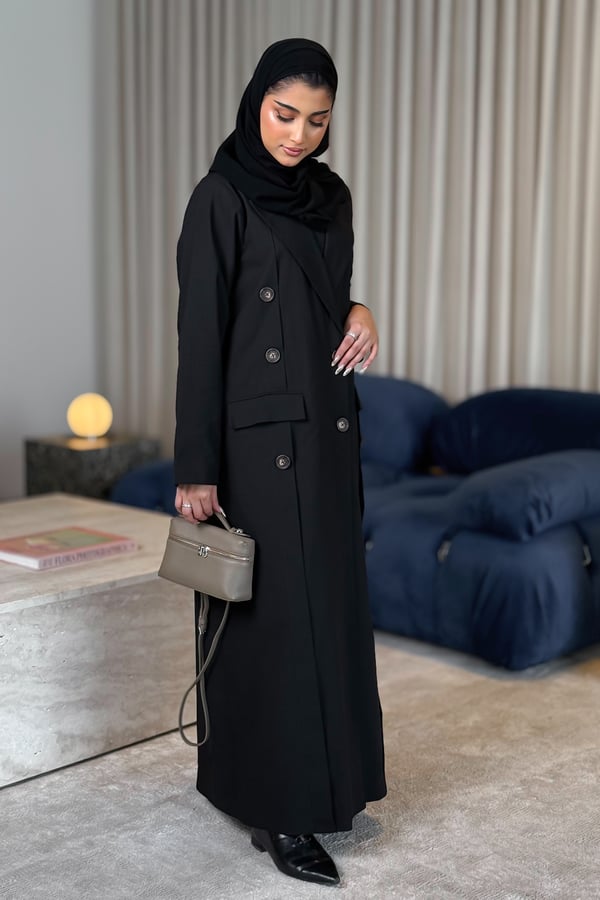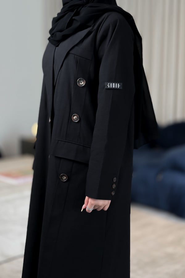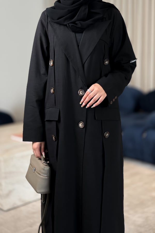 عباية بليزر بكتافيات وقصة نظيفة. متوفرة بخامتين: لنن وكوبا. الخامة المعروضة: لنن.